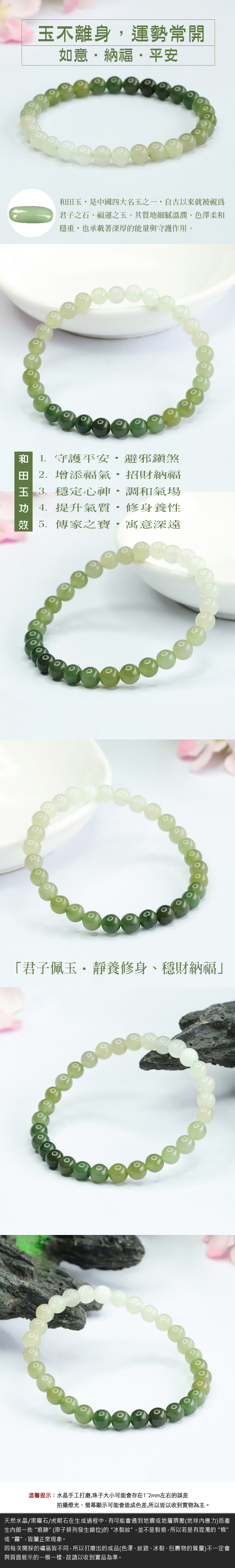 和田玉:長期配戴能提升人的氣場與自律,象徵內斂含蓄、溫文儒雅,讓人自然散發知性與親和力。